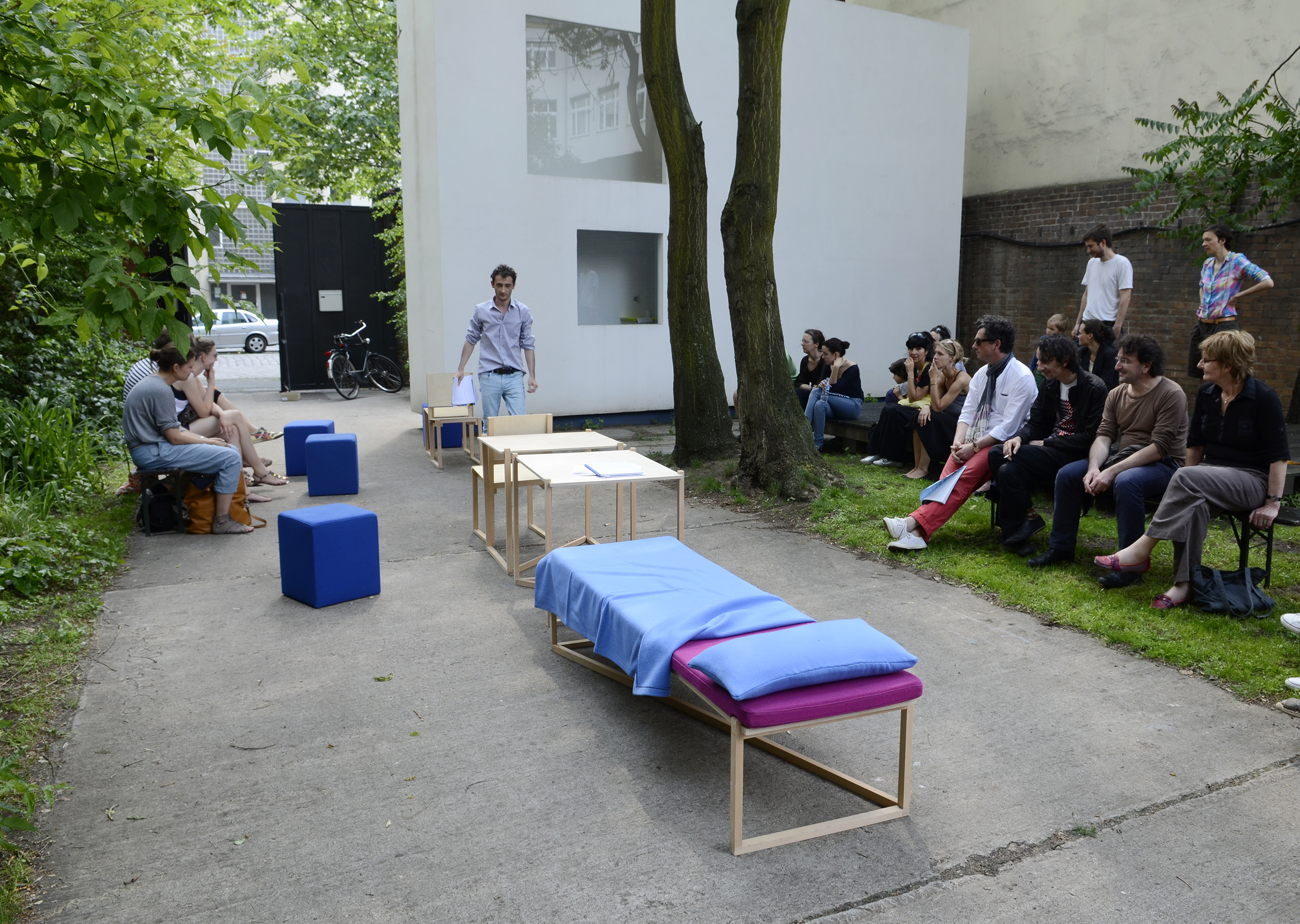 While living in the house, I rearrange other people’s phrases or my own, I reorganize the sequence of furniture in relation to my activity. PLAy is an event where such lines, such sequences or phrases, are deployed in front of a public, in the house’s shadow, and like texts, they are read silently, they are whispered, they are read out loud, or they are given to be read by someone else. They are then unfolded, arranged over time.